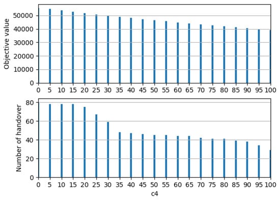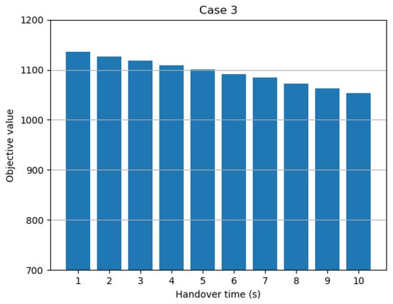 Based on the coefficients determined above, a sensitivity analysis was conducted according to the penalty term, the minimization of the number of handover, as shown in Figure 12. It is trivial that the objective function value decreased with increasing . One interesting point is that the number of handover decreased step-wise. These results indicate that, if is smaller than necessary, the overall objective function value can be high, but there are many unnecessary handovers. Therefore, choosing at which it starts to no longer decrease is the best decision to maximize the objective function value and reduce the number of handovers. Thus, of 35 was chosen for this case.