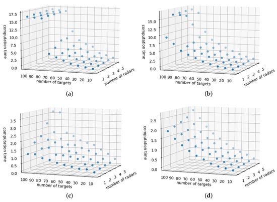 MILP formulation complexity as of computation time according to the change of simultaneous tracking capability. (a) Computation time when . (b) Computation time when . (c) Computation time when . (d) Computation time when .
