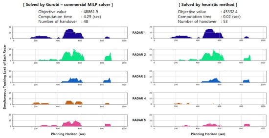 Figure 14 shows the number of targets being simultaneously tracked by each radar over the planning horizon for the exact and heuristic algorithms. As can be seen in the figure, the simultaneous tracking load of each radar clearly increased between 400 and 650 s because targets were the most frequent and concentrated at that time. In terms of an objective value, the result of the proposed formulation solved by Gurobi commercial MILP solver returned 48861.9, while the heuristic algorithm gave a value of 45,332.4, an approximately 8% difference in performance. This was noticeably exhibited mainly in the simultaneous tracking loads of Radars 4 and 5, as shown in Figure 14. The reason for this is that the heuristic approach to solving this problem is to maximize the time that each radar tracks in a greedy manner. This phenomenon is explained by the local optima convergence, which is a typical disadvantage of the heuristic approach, and therefore shows an assignment result that is not properly distributed. Meanwhile, 48 handovers took place between the radars in the case of exact algorithm while 53 handovers occurred in the case of heuristic algorithm. When we compared performance with these results, we considered two main things: the number of handovers that act as the the penalty function in the objective function and the objective value obtained. The simulation results are more than simply comparing the objective values and having a low number of handovers. The absence of unnecessary handovers is much more advantageous in terms of radar operation. Although there are differences in the number of handovers depending on how to solve the problem, the target can be tracked for a much longer period of time than in the case without handovers between radars, and the resulting time margin would provide valuable time for the preparation of the next battle for each interceptor. The computation time of exact algorithm case was approximately 4.27 s longer because the solution using the Gurobi solver investigated as many cases as possible to find the optimal solution.