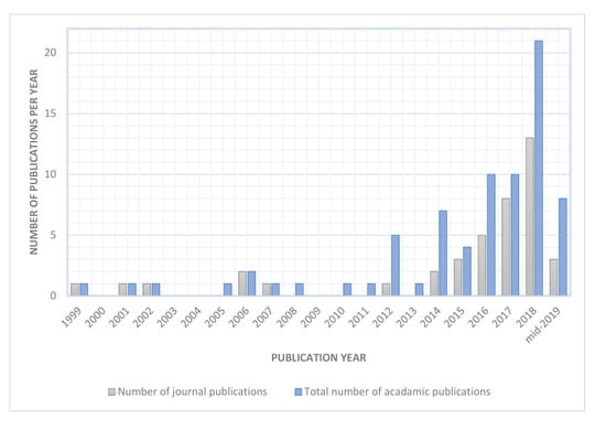 Starting in the late 2010s, there was an increasing interest in the development of FMG technology, as shown by the number of academic publications depicted in Figure 1. A total of 76 papers were found between 1999 and mid-2019 (the list shown in Table A1 of the Appendix A).