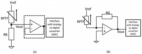 The most commonly used circuitry to extract the signal of the RPTF sensor is the voltage divider because of its simplicity. As shown in Figure 4a, the voltage divider setup only requires one bias resistor (RB) to condition the output voltage of the RPTF sensor. The bias resistor can be “pull-down” to the ground as shown in Figure 4a or “pull-up” to the Vref with one sensor terminal connecting to the ground. The output of the voltage divider can then be buffered using an op-amp with a unity gain configuration, before being digitized with a signal acquisition device such as a microcontroller with an analog-to-digital converter interface. However, the main drawback of using such circuitry is the non-linear response of the voltage output, which adds an unknown layer between the muscle stiffness and the sensor reading. This non-linearity also complicates the sensor drift characteristic as pointed out by Esposite et al. []. To reduce the non-linearity of the output response of the sensor, the manufacturer of the sensor has suggested using a current-to-voltage setup, as shown in Figure 4b. This setup has been adapted in some FMG papers, with slight variations [,,,]. In such a setup, an op-amp and a resistor (RG) for controlling the output gain have to be used. The voltage across the sensor is constant and the output voltage is proportional to the current passing through the sensor. This setup produces a more linear response across the full force range of the sensor. However, such circuit is not strictly needed if the desired characteristic is predetermined based on the targeted application. For example, the force range for FMG is typically under 2 N for the FSR402, which has a sensing area of 1.8 cm2. By selecting a proper value of the bias resistor, e.g., <10 kOhm for the FSR402, a voltage output response that has strong linear characteristics can be obtained within the functional range []. In some applications such as gesture prediction, the linearity characteristic of the signal plays a less important role, as long as the signal patterns are different among gestures.