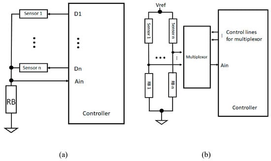 For most FMG applications, more than one sensor is needed to extract the stiffness pattern from different muscles. Researchers often insert the elementwise sensors into a strap or a socket to capture the pattern for gesture identification or to predict limb motion. The number of sensors can range from two to 32, or even more. Depending on the number of sensors, a customized signal acquisition device is needed. For a device with less than eight channels, researchers often directly replicate the voltage divider setup for each sensor and feed those signals directly to the ADC terminal of the signal acquisition device [,,]. The reason for only eight channels is because many low-cost microcontrollers or signal acquisition devices are already equipped with eight independent analog input terminals, which simplifies the overall signal acquisition process. For more than eight inputs, the line scanning method is often adopted. Simply speaking, the line scanning method turns the sensors on-and-off sequentially and only allows the signal from one sensor at a time to be fed to the input terminal. Using such a method, the maximum sampling rate is lower compared to the parallel input setup because of the delay due to sensor switching and the fact that only one sensor at a time can be read. Two examples of the line scanning circuitries are shown in Figure 5a,b. For the circuity in Figure 5a, one of the sensor terminals is connected to a common line, which is injunction with a bias resistor (RB) and the analog input terminal (Ain). The other terminal of each sensor is connected to a tri-state digital pin. At any time, only one sensor is in the “on” state by setting the corresponding digital pin “High” and the rest in a high-impedance state. The reason for setting the rest in a high-impedance state instead of the “Low” state is to reduce cross-talk among the sensors []. Figure 5b shows a more commonly seen line scanning circuitry, which uses a multiplexor to control which sensor output can be read through the analog input terminal []. This multiplexor approach can be used for the voltage divider circuitry as well as for the current-to-voltage converter setup.