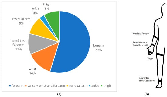 Information and depiction about the FMG sensor placement. (a) Percentage of sensor placement found in the literature (n = 73). (b) Depiction of FMG sensor placement.