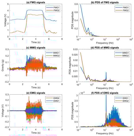 An example of FMG, MMG, and sEMG signals from the forearm during an isometric squeezing action is shown in Figure 9. The blue lines show the signals captured from Sensor 1 while the orange lines show the signals captured from Sensor 2. The left column shows the captured signals in the time domain and the right shows the corresponding power density spectrum (PDS) using Fast Fourier Transform.