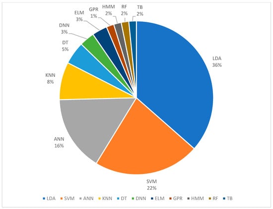 The percentages of different classification algorithms used in FMG literature is shown in Figure 10. The percentages shown in the figure include some of the work that used multiple classifications algorithms for performance comparison; the percentage is based on the total instance that each method was used and not on the number of publications. As shown in the figure, 37% of the publications use linear discriminant analysis (LDA), 23% use support vector machine (SVM), 15% use artificial neural network (ANN), and the rest use k-nearest neighbor (KNN) [,,], decision tree (DT) [], deep neural network (DNN) [,], extreme learning machine (ELM) [,], Gaussian process regression (GPR) [], hidden Markov model (HMM) [], random forest (RF) [,], and tree bagging (TB) [].