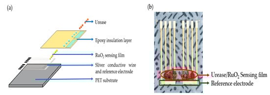 RuO2, a transition metal oxide with high-temperature stability, low resistivity, and good diffusion barrier properties was used in this study to fabricate the flexible arrayed urea biosensor. The production process of flexible arrayed RuO2 urea biosensor was similar to Chou’s previous work []. The structure diagram of the flexible arrayed RuO2 urea biosensor is shown in Figure 1.