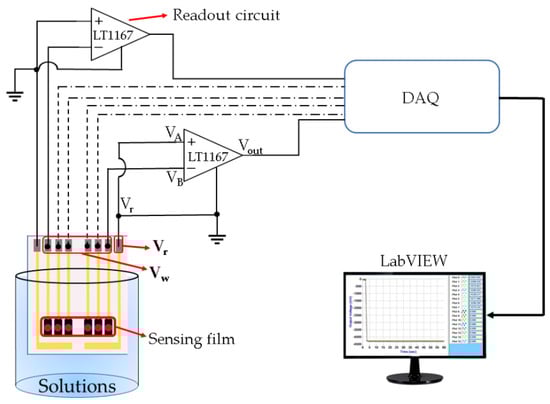 The sensing characteristics of the flexible arrayed RuO2 urea biosensor was measured using the V–T measurement system. The V–T measurement system had been reported in previous studies [,]. The measurement system consisted of an LT1167 instrumentation amplifier (Type: LT1167CN8#PBF, Linear Technology/Analog Devices Crop., Norwood, MA, USA), a data acquisition (DAQ) device (Type: USB-6210, National Instruments Crop., Austin, TX, USA), and a program system software (Type: LabVIEW, National Instruments Crop., Austin, TX, USA). The schematic diagram and the actual V–T measurement system used are shown in Figure 2 and Figure 3, respectively. In Figure 3, the V–T measurement system was composed of a power supply, a readout circuit (LT1167), a data acquisition card (DAQ device, Model: NI USB-6201, National Instrument Corp., Austin, TX, USA), and a computer with LabVIEW program [,]. The response potential was sensed by the readout circuit. To obtain the digital signals, the output voltage will be transmitted to the DAQ device. Finally, the digital data were transmitted into the computer and analyzed by the LabVIEW program. The LT1167 instrumentation amplifier is a precision electronic component with a high input impedance of about 200 GΩ, which means that the input signal will not be attenuated; the disadvantage of this is that the input noise may be amplified resulting in unstable measurement results. The LT1167 instrumentation amplifier has the advantage of a higher common-mode rejection ratio (CMRR) (90 dB, G = 1) and power supply rejection ratio (PSRR) (105 dB, G = 1), which means that the amplifier is effective in resisting noise and power noise. The LT1167 instrumentation amplifier’s gain was set between 1 (0 dB) to 1,000 (60 dB), which was controlled by an external resistor. The LT1167 instrumentation amplifier was used to read the response voltage of the biosensor. The output voltage and gain were computed as: