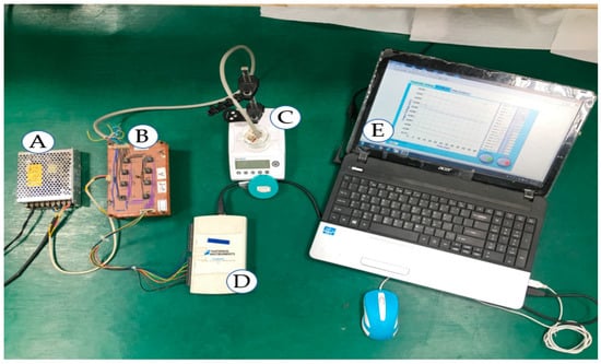 The actual V–T measurement system. (a) DC power supply. (b) Readout circuit. (c) Urea solution and urea biosensor. (d) Data acquisition (DAQ) device. (e) Computer.