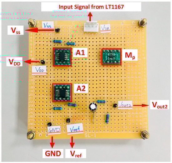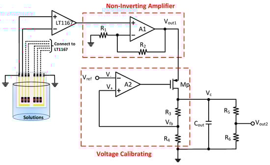 A new calibration circuit (NCC) was proposed by this study to reduce the drift effect of the flexible arrayed RuO2 urea biosensor as shown in Figure 4. This NCC consisted of a non-inverting amplifier (A1, R1, and R2) and an error amplifier A2, a P-MOSFET transmission transistor Mp, a negative feedback network (R3 and R4), an output voltage capacitor Cout, and a resistor divider (R5 and R6). The implementation of the proposed NCC is shown in Figure 5. The operational amplifier OPA130 was used as the error amplifier A1 and A2. A P-Chanel MOSFEF FDN340P-ND was utilized as the drive transmission transistor Mp. The proposed circuit was attached to a real circuit board with simple discrete devices such as resistors, capacitors, field-effect transistors, and amplifiers for its simplicity. The operational amplifier OPA130 is a low-power precision FET-input operational amplifier, which has a higher CMRR (90dB min) and has good noise resistance. It also has a wide voltage supply range (V+ & V- = ±2.25 V to ±18 V), which means that the non-inverting and the inverting inputs of the OPA130 have a wider range. The amplifier magnification factor was improved by controlling its bias in the non-saturation mode. The low response voltage of the biosensor was amplified by the non-inverting amplifier, enabling transmission of the transistor Mp in the linear region. Mp provided output current to charge the output load capacitor (Cout) maintaining Vc at a high level. The mechanism of the voltage regulation is depicted as follows: it is implemented by the negative feedback resistors (R3 and R4), and the feedback voltage network is expressed as the formula in Equation (3).