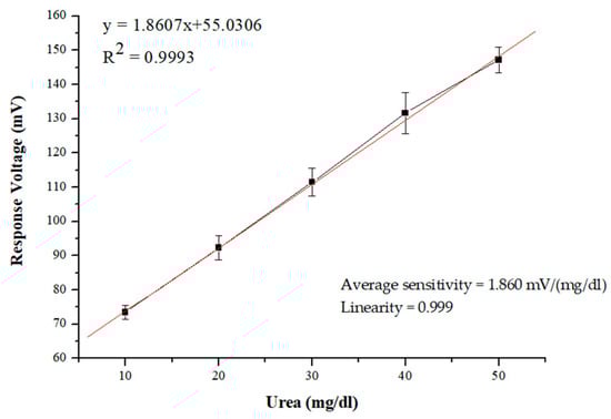 In this chemical equation, urea reacts with urease and is converted to ammonium (NH4+), bicarbonate (HCO3−), and hydroxide ions (OH−) []. The sensing properties of the flexible arrayed RuO2 urea biosensor were measured by the V–T measurement system. The flexible arrayed RuO2 urea biosensors were immersed in 10, 20, 30, 40, and 50 mg/dL urea concentration solutions. The output voltages were measured by the V–T measurement system five times. The results of the sensing measurement are shown in Figure 6. The average sensitivity and linearity recorded were 1.860 mV/(mg/dL) and 0.999, respectively. Moreover, the limit of detection (LOD) was estimated in this study. Limit of detection (LOD) is defined as the lowest concentration of analyte that can be detected in the analyte, but not quantitated []. In this experiment, a RuO2 urea biosensor was immersed in a buffer solution, and the LOD was measured by a V–T measurement system. To obtain the analyte concentration of the LOD urea biosensor, we followed the three sigma rule [] and the equations are shown as follows: