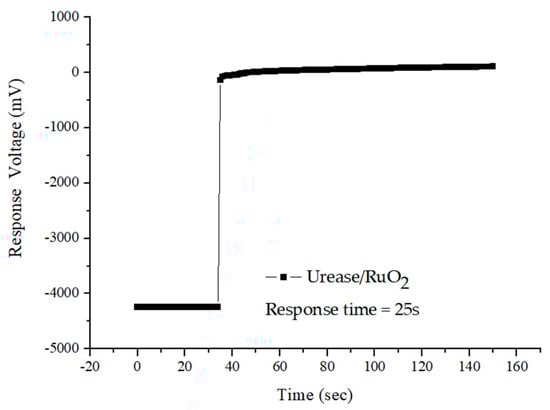 To measure the response time of the urea biosensor, the RuO2 urea sensor was immersed in 30 mg/dL urea solutions. The response voltage of the sensor did not change immediately when the input potential signal change occurred. It required some time to change from origin state to a stable state. The response time is defined as the time required for the sensor output to change from its original state to 95% of its equilibrium value []. In this study, the response time of the flexible arrayed RuO2 urea biosensor was measured by the V–T measurement system. The result of the experiment’s response time is shown in Figure 7. The RuO2 urea biosensor exhibited a fast response time of 25 s.