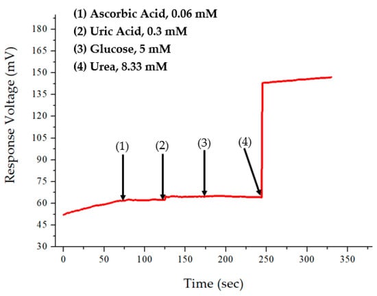 The interference effects could determine the type of urea biosensor to be used. The selectivity of the urea biosensor is related to the analyte measurement, and the potential interference for the human body could be uric acid, ascorbic acid, and glucose []. For the experiment, interferences were added in the measurement to determine the performance of the urea biosensor and to test the selectivity of the RuO2 urea biosensor. During practical application, the interference solutions were selected based on the normal range of the solutions obtained on the sample human blood. The urea sensor was first immersed into the test urea solution 1.66 mM (10 mg/dL); then, the ascorbic acid solution (0.06 mM), uric acid solution (0.3 mM), and glucose solution (5 mM) were added into the test solution, sequentially. Finally, the 8.33 mM (50 mg/dL) urea solution was added to the test solution. The results of the interference effect are shown in Figure 8. It was observed that the flexible arrayed RuO2 urea biosensor was not easily interfered with by other materials.