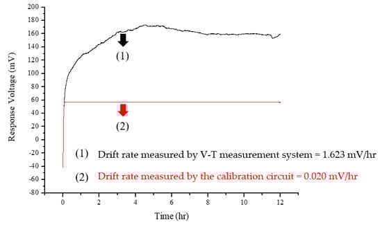 The drift rate is a non-ideal effect in a biosensor during the measurement process. During long-term measurement, the response voltage of the sensor will gradually reach a stable level; this is called the drift rate [,,]. In practice, the response voltage slowly changes proportionally with time during long-term measurement. Most researchers believe that this as a tedious and an unsolved issue. Based on previous studies [,,], the response voltage of sensors stabilizes after 5 h. The drift rate can be calculated using Equation (5).