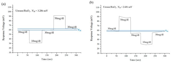 Traditionally, biosensor devices’ readout results are usually recorded more than twice, as with the RuO2 urea biosensor. The concentration of the test solution could be changed after resumption originally buffers solution. There might be a voltage difference during the second time measurement process. This is called the hysteresis voltage []. Typically, the hysteresis voltage is due to the change of response potential. The hysteresis effect can be measured by immersing RuO2 sensing films in the loop of urea solutions for 60 s in different urea solutions. Then, the difference of initial and last response voltages of the same urea solution is called hysteresis voltage []. The hysteresis effect was measured by immersing the flexible arrayed RuO2 biosensor in a urea solution in the loops of 30 mg/dL → 10 mg/dL → 30 mg/dL → 50 mg/dL→ 30 mg/dL and 30 mg/dL → 50 mg/dL → 30 mg/dL → 10 mg/dL → 30 mg/dL, respectively. Figure 10 shows the hysteresis effects of flexible arrayed RuO2 urea biosensor. From the results, the hysteresis voltages of the RuO2 urea biosensor in the loop 30 mg/dL → 10 mg/dL → 30 mg/dL → 50 mg/dL→ 30 mg/dL was 3.286mV. The hysteresis voltages of the RuO2 urea biosensor in the loop 30 mg/dL → 50 mg/dL → 30 mg/dL → 10 mg/dL → 30 mg/dL was 2.681 mV.