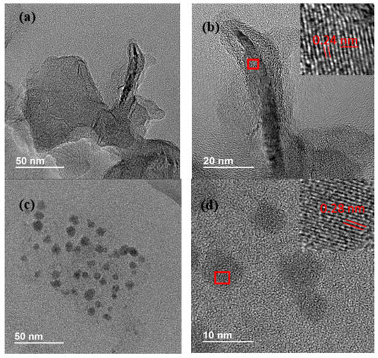 A high-resolution transmission electron microscopy (HR-TEM) analysis was conducted to characterize graphene and perovskite nanocrystals independently. Figure 1a shows graphene layers with diameters near hundreds of nanometers. The interplanar distance obtained was 2.4 Angstrom (Figure 1b), showing a suitable graphene crystallinity. The perovskite synthesis method produces small nanocrystals, these lead halide perovskite nanocrystals to appear as dark spots (Figure 1c) with an average size of 7.1 ± 2.2 nm (see Figure S3 in the Supplementary Materials). Figure 1d shows the high crystallinity of the perovskites synthesized (Figure 2b), with a calculated interplanar distance of 2.8 Angstrom.