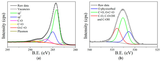 According to the XPS elemental quantification, the graphene used presents a 7.8% content of oxygen and 92.2% of carbon. The results of the XPS fitting analysis are represented in Figure 3. The C1s spectrum, centered at 284.35 eV, is deconvoluted in seven peaks (Figure 3a). The component at 284.2 eV is characteristic of photoelectrons emitted from carbon atoms, associated with sp2 carbon systems in the “graphite-like” [42]. The peak reproduced at 290.5 eV is also characteristic of sp2 carbon systems, but in this case due to the π-π* interactions and π plasmon, which is derived from the energy loss due to the excitation of π electrons [43]. Components associated with carbon in amorphous or sp3 configuration appear at 285.0 eV [44], and defects associated with carbon vacancies appear at 282.9eV [45]. Meanwhile, associated to carbon-oxygen bonds, three peaks can be observed at 286.5 eV, 288.1 eV and 289.0 eV, which correspond to C-O, C=O and carboxylic groups, respectively [46]. Peak quantification is summarized in Tables S1 and S2 (see the supporting information).