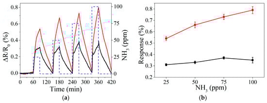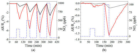 Example of resistance response when detecting NO2 at room temperature in the range of 250–1000 ppb (a) and 25–100 ppb (b). In both figures, black and red line corresponds to bare graphene and perovskite doped graphene, respectively. The concentration of NO2 applied is shown in right-Y, represented by a blue dashed line.