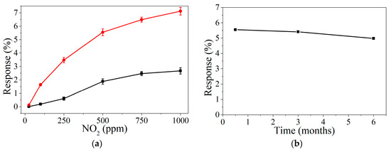 A stability study of graphene loaded with perovskite nanocrystals was conducted (Figure 5b), revealing a slight decrease in the response towards 500 ppb of NO2 after six months of sensor operation. This result confirms the high stability of MAPbBr3 under ambient moisture and reactive gases, probably due to the nanocrystal structure of the perovskite. Zhu et al. [28] report the high stability of perovskites in nanocrystal structure over other alternatives. Besides, in our work, the perovskites are probably protected by the hydrophobic properties of graphene.