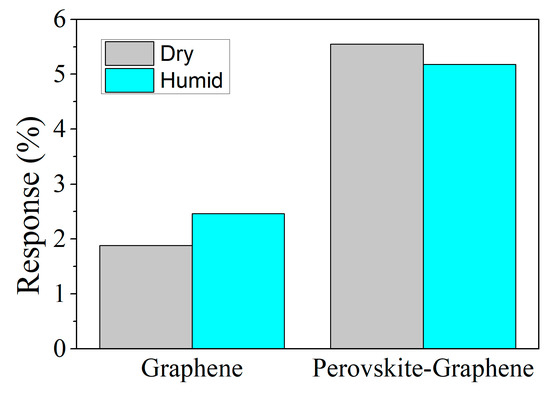 Additionally, the sensitivity under dry and humid conditions was evaluated to both, bare and perovskite loaded graphene. Figure 7 shows an increase in the response for graphene to 500 ppb of NO2 (about 30%) when moisture is present. However, graphene decorated with perovskite nanocrystals shows a very stable response with only a slight decrease (about 5%) when under humid conditions.