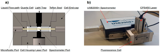 (a) Simplified cross-section of the microfluidic cell showing the assembly of key components. The cells outer dimensions are 30 × 30 × 48 mm. Notably, the liquid flow-path is a continuous cylinder throughout the entire illuminated path, significantly reducing the entrapment of bubbles inside the cell. (b) The assembly of the full fluorimeter illustrating the connections between the fluorescence cell, CPS450 laser and USB2000+ spectrometer.