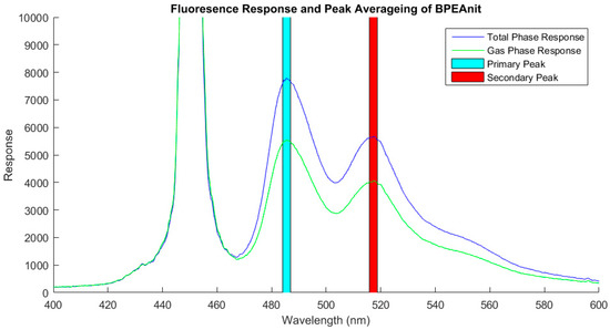 The typical fluorescence response measured for the 9,10-bis(phenylethynyl)anthracene-nitroxide (BPEAnit) probe with the flow-through fluorimeter for a total phase and gas phase sample. The response wavelengths averaged for the measurement of the primary and secondary peaks are indicated by the blue and red shaded regions, respectively. The large third peak centred on 450 nm is the laser used as the excitation source.