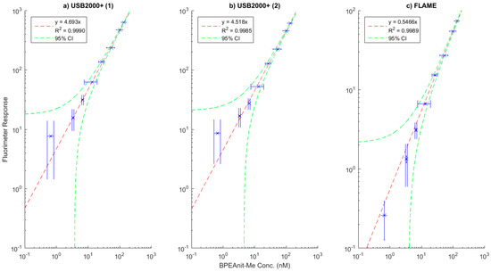The calibration plots of three flow-through fluorimeters constructed using the design discussed in Section 2.1.1 are shown in Figure 3.