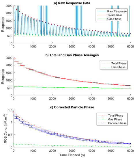 In order to correct for the contributions of gas phase ROS collected during measurements, the PINQ sample continuously alternates between total and gas phase measurements through the use of the flow-switching assembly. An example of the spectrums obtained for total and gas phase samples is given in Figure 2. This results in a time series which oscillates periodically as the sample is switched between gas phase and total phase measurements. The magnitude of this signal oscillation is directly proportional to the PM-bound ROS concentration in the sample aerosol. To calculate final concentrations, the first 60 s of data after each valve switch is removed as this data represents the mixing of the two phases during the PINQ response time. The remaining data is then split into total and gas phase signals, and the mean values are calculated. The gas phase signal is then interpolated to the same time base as the total phase using the spline interpolation function in Matlab; it was also corrected for background fluorescence and converted to equivalent moles of BPEAnit-Me per cubic meter of air as detailed in a previous work [27]. Finally, the PM-bound ROS concentrations are found by subtracting the gas phase from the total phase.
