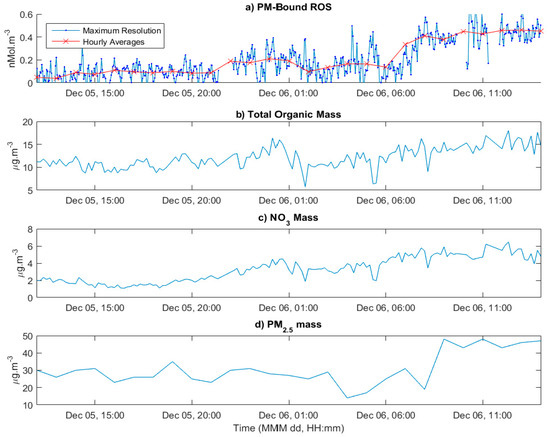 The correlations presented in Table 1 indicate the PINQ measurements correlate to varying degrees with all the major ion masses measured by the TOF-ACSM. This is not an expected result and is likely due to the pollution event observed at approximately 06:00 on December 12 (see Figure 6). This resulted in increases in the PM-bound ROS, total PM2.5 mass and to varying degrees all mass components measured by the ACSM. PM-bound ROS and total PM2.5 mass both experienced a two-fold increase over this period, resulting in relatively constant ROS per PM2.5 mass. As such, no significant observations regarding the influence on chemical compositional on PM-bound ROS can be made over a short period. Instead, the correlations shown in Table 1 are likely due to their shared relationship with total PM2.5 mass. This highlights the need for significantly longer periods of data collection with systems like the PINQ if the sources of PM-bound ROS in the atmosphere are to be understood.