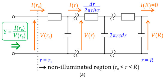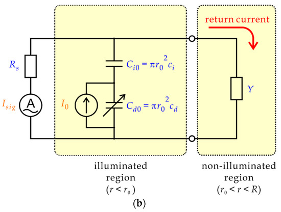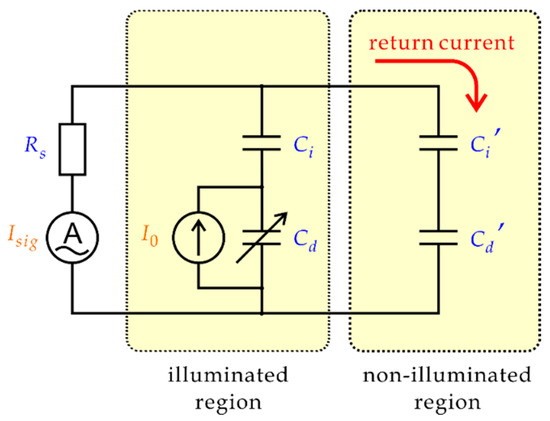 Figure 2 gives only an intuition that the capacitive coupling increases with the area of the non-illuminated region and the frequency of the ac current. It can be easily speculated that a loss of the signal current due to the return current may have a large impact on the signal-to-noise ratio, the spatial resolution, and the sensitivity. To be able to understand the dependence of the return current on various parameters and to evaluate its impact on the sensor performance, the model shown in