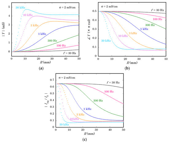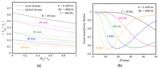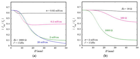 were kept constant at 1800 Ω and 1 kHz, respectively. When the solution is less conductive, the effect of the return current is relatively smaller, because the lateral resistance will limit the distance from the center, within which the capacitive coupling contributes to the return current. It should be noted, however, that a smaller conductivity of the solution also implies a higher resistance of the solution between the illuminated point and the reference electrode, which increases