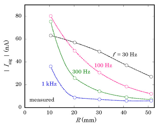 A series of experiments were carried out to observe the dependence of on and in a real situation. A large-area LAPS plate was prepared by depositing 50 nm SiO2 and 50 nm Si3N4 successively on the entire surface of a 6-inch n-type Si wafer with a thickness of 200 μm and a resistivity of 1–10 Ωcm. An ohmic contact was evaporated on the perimeter of the back surface. To define different sizes of contact areas between the solution and the sensing surface, various sizes of cylindrical liquid containers to accommodate the solution were prepared by a 3D printer and attached to the sensing surface via O-rings with inner diameters 21.0, 40.5, 60.5, 82.5, and 102.5 mm. The solution used in this experiment was 0.1 wt% NaCl solution with a specific conductivity = 2.0 mS/cm and the height was = 10 mm. A Ag/AgCl reference electrode (RE-1B, BAS Inc.) was dipped into the solution at the center.