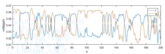 In order to more clearly show the complementary characteristics of I and Q, we only show the amplitude of 200 pairs of signals. We can see that their trend is completely in keeping with the law described in Equation (9) and the phase difference changes irregularly, so it is a random variable and varies sharply between two consecutive samples, but it can be seen from Figure 3 that within one sample, it has not changed much. So, within one pulse, the can be considered unchanged.