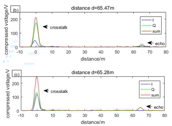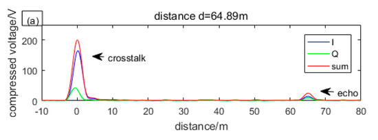 Among them, denotes the amplitude of the crosstalk and denotes the phase difference between crosstalk and local. After convolutional compression, we can get two narrow pulse envelopes of crosstalk and echo respectively. Then the distance of the target can be obtained from the difference in time between crosstalk and echo