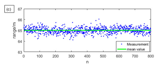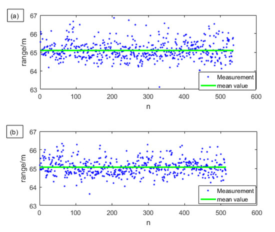In order to illustrate the improvement of 90-degree optical hybrid in ranging performance, we use 800 sets of I and Q signals to separately measure the distance and compare their results with using the sum. We only keep those measurement results whose SNR are greater than or equal to 13 dB. The results are shown in Figure 6. The blue points are the valid distance measurement results, and the green line is the mean of the distance.