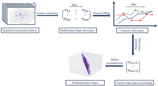 Presented in this paper is a novel algorithm to model the life cycle of defects manifested as either 2D or 3D point clouds. Point cloud data are geometric representations of defects that can serve as a consistent record of the state of a structure at a given inspection interval and provide a basis for finite element analysis, among other uses [,]. This algorithm extracts latent features from these defect point clouds through computational geometry, fits a time-series process model to the evolution of those features, and uses a stochastic forecasting model to predict the future state of the defect. Consequently, a predictive analysis with regard to the future condition of the structure could be carried out by linking the modeled evolution of defects to a numerical simulation, ultimately helping to provide a complete representation of structural performance and integrity over time. This paper does not consider the predictive simulation aspect of this process, and the readers are referred to References [,,,] for potential applications in this domain.