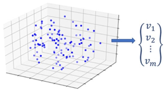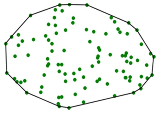 Here, we propose that the feature extraction can be done using the concept of a geometric convex hull. The convex hull of a point set is a unique representation of a point set in Rn, defined as the smallest convex polygon that surrounds all points in the point set (Figure 2) []. In R3 or higher-dimensional data spaces, the convex hull is similarly defined as the minimum convex polyhedron of the point set. It should be noted that, while this parameterization reduces the information complexity of the point cloud, the use of a convex hull serves to maintain the dimensionality of the underlying geometric object under observation. This is critical for reconstructing predicted defect states.