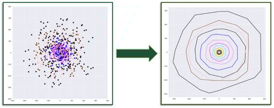 The convex hull of point cloud P is a uniquely defined convex polygon. A natural way to represent a generalized polygon is by listing its vertices in clockwise order, starting with an arbitrary starting point. As such, the problem to be solved is as follows: given a point set P = {p1, p2, …, pm} in Rn, compute a list that contains those points from P that are the vertices of the convex hull, CH(P). To find those vertices, the algorithm sorts all points through a “divide and conquer” approach []. The convex hull algorithm finds two points with maximum and minimum spatial coordinates in a single dimension and computes a line joining these two points. This line divides the whole set into two halves. For a given half it finds the points with a maximum distance from the dividing line, forming a triangle defined by minimum and maximum point distances. Those points inside the triangle are determined to not be part of convex hull. Then, these steps are iteratively repeated to search for points with maximum distance from the separating line, until there is no point left outside of the computed triangles. The points selected at this step constitutes the convex hull. The convex hull results in a vector containing the Cartesian coordinates of the hull vertices. This extracted vector of vertices is the numerical descriptor that is later fit to a stochastic process model (Figure 3).