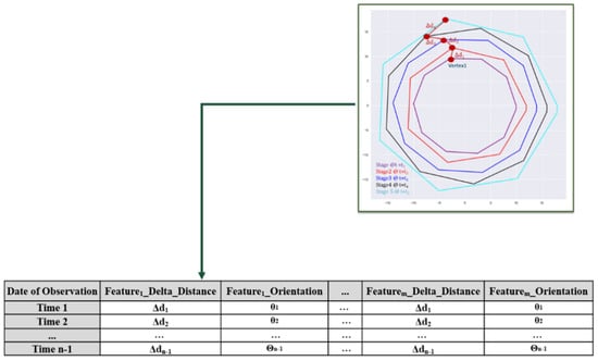 At each time step, the NN of vertices in two time steps are determined, and the change in magnitude and orientation between matched vertices is computed and compiled for the complete temporal sequence (Figure 5). This resulting dataset consists of the distances and orientations of vertex changes between subsequent hull stages throughout a time series. This dataset is illustrated for the identified and aligned multiple stage of a defect with a polygon shape in Figure 4 and Figure 5.