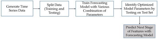 The overall approach to time-series modeling is illustrated in Figure 6 and presented here. Once the dataset representing the evolution of defects is constructed (Section 2.2), a stochastic model can be fit to the dataset to model the dynamics of defect evolution. Each column of this dataset is a time series that represents the evolution of each feature over time. Time-series forecasting is performed in order to capture the underlying long-term life-cycle trends in inspection data. The model can then be used to extrapolate the time series into the future. This modeling approach is particularly useful when the temporal behavior is stochastic, as opposed to understood deterministic evolution, and where the relationship between parameterization variables is not well understood []. For example, in the problem presented later in this paper, there is no knowledge available on the boundary conditions (i.e., applied load and support reactions) of the tested structural component, and there is no established deterministic model for the propagation of fatigue cracks.