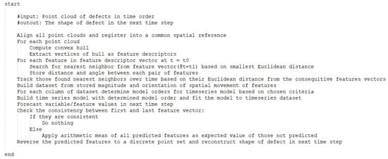 The pseudocode for the complete algorithmic methodology is shown in Figure 7. Upon reconstruction of the predicted geometric configuration of a defect, it is then possible to update a numerical simulation to account for the predicted change in the structure’s geometry due to the defect. This updating process is not tested here, but such capabilities were developed in prior related work, including efforts by the authors [,,].
