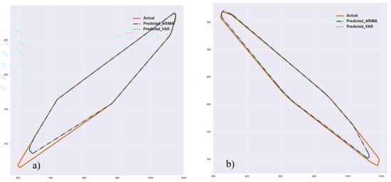 Performance of the proposed algorithm for predicting a single future step is evaluated in this section. Both ARIMA and VAR model were used to find the pattern of crack growth and predict the future state of crack. The convex hulls of the right and left cracks at a load of 80,000 cycles were computed and held out as the ground truth for one single-step prediction. Results are shown in Table 4 and Figure 9. Since the performance of the ARIMA and VAR model was almost identical, the predicted shape from both models had overlap, and only the ARIMA model can be seen in the Figure 9.