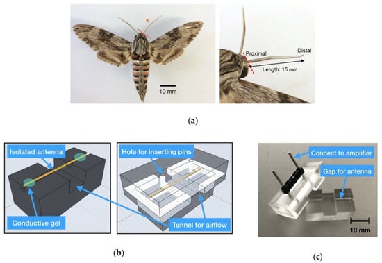 As odourants are intermittently distributed in the air, fast response and recovery time of sensors are important for tracking patchy distributions [8]. However, in particular, the recovery time of conventional gas sensors, such as semiconductor and conductive polymer sensors, is not sufficiently fast to resolve temporary changing odour information [9,10] compared to insect antennae (i.e., the olfactory organs of insects). This makes the sensing process more difficult. Although odour detection strategies for flying insects have been extensively studied [11,12,13], it is difficult to implement their algorithms to robotic platforms owing to the use of artificial sensors [6]. In contrast, using the electroantennogram (EAG) technique for measuring the nerve signal output of an insect’s antenna for a given odour [14] is a direct method that employs an insect’s ability to capture olfactory information at a high speed and rapid recovery rate.
