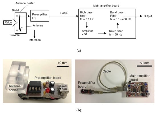 To amplify and filter the EAG signals, we used custom-build amplifier boards consisting of a preamplifier and a main amplifier (Figure 2a). The preamplifier was a voltage-follower with a unity gain, and the main amplifier had a voltage gain of 51 V/V. To eliminate 50 Hz noise from the alternate current, a notch filter was implemented. High- (cut-off: 0.1 Hz) and low-pass (cut-off: 400 Hz) filters were also implemented to remove the direct current (DC) offset and high-frequency noise. After setting up the antennae, the antenna holder was directly connected to the preamplifier board with pins (Figure 2b).