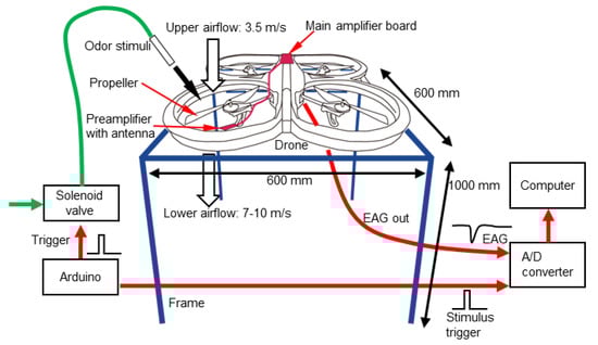 This study focuses on the noisy EAG signal recorded from the flying drone. However, even if we fixed the position of the odour source, because a flying drone would not stay at a certain position, conditions such as the distance between the odour source and the drone would change every second. Tethered flight experiments can reduce the uncertain factors, simulate the flying condition, and make us concentrate on signal detection. To simplify, in the experiment, we fixed the drone on a set of frames sized 600 (L) × 600 (W) × 1000 (H) mm (Figure 3). We aimed at collecting EAGs from the antenna under the hovering airflow condition. When the propellers are not active, it can be considered that the drone is on the ground. However, once the propellers start to rotate, we can simulate the condition of a flying drone. The altitude of 1000 mm is the normal one when the drone is autonomously hovering. To verify the result of the free hovering flight [29], we measured the wind speed over a propeller and under it during a tethered flight using a hot-wire anemometer (DT-8880, CEM, Shenzhen, China). The result just matched the theory in that the later reading value was around 7–10 m/s, which was almost double the former (Figure 3), as the sensor can catch the chemical plume more than twice and enhance the sensing opportunities. Therefore, we fixed the preamplifier board under the propeller (front-right) so as to capture the odourant with the antenna. We also confirmed that the position of the antenna can catch an odour coming through the propeller using a photoionisation detector (miniPID 200B, Aurora Scientific, Aurora, ON, Canada). The main amplifier board was attached to the upper side of the body. The total weight of the amplifier board including a battery was 54.4 g, which was sufficiently light for the drone to carry if it flies freely.