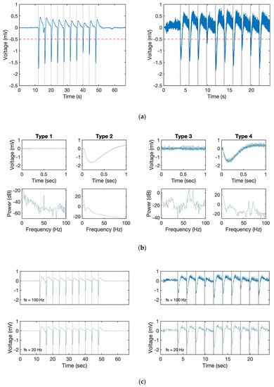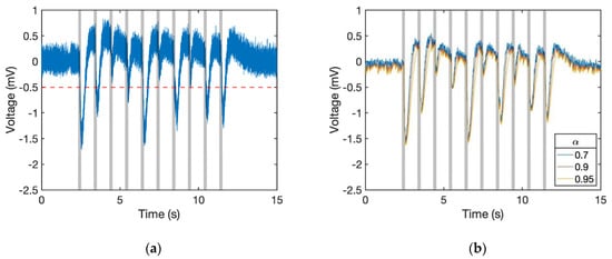 Figure 6a shows the situation with drifting standard voltage. As the signal around the 5th second did not remain at 0 mV, once we set the threshold at −0.5 mV the response cannot be detected. To solve the problem, we made the positive response smaller than the negative one by using a computation method. Because the EAG response is negative, we can apply an exponential moving average (EMA) filter, which is also known as a type of infinite impulse response (IIR) filter, onto the system for making the signal smoother. At time period n, the filtered data y can be known by the original data value x through Equation (1).