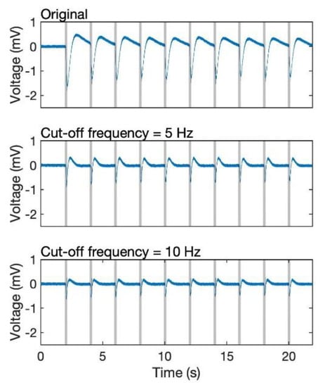 Because odourants are distributed intermittently in the air, the odour response of the EAG is a pulsed signal. The frequency of odour contact depends on the distance from the odour source and strongly influences the tracking trajectories of insects [34]. Therefore, detecting the odour pulses from the EAG is the goal of signal processing. The most simplified method for detecting an odour stimulated signal would be to set a fixed threshold. Once the sensor reading reaches the assigned value, it would be considered as a gaseous signal. From Figure 4a, the amplitude of a single response is on the interval [−1.8 mV, 0.5 mV]; however, a fixed threshold (for example, −0.5 mV) for verifying whether the biosensor detects odourants or not leads to an erroneous result owing to the bias of the EAG signal. This is because the frequency component of EAG response is less than 10 Hz (Figure 4), it is overlapped with that of the bias, which was also reported by Kuwana et al. [26]. Therefore, even though a high pass filter can be used for removing the DC component, it also decreases the amplitude of the EAG responses as their major frequency is extremely low (Figure 5). Thus, we build an additional algorithm that can robustly achieve odour detection even if the bias does not go back to the original, and it should have the ability for us to find out the timing of the stimulus.