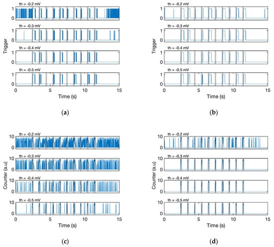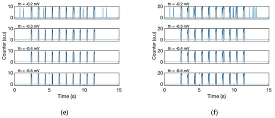 Results of different algorithms. The blue line indicates output of each algorithm. The original data are shown in Figure 6. (a) Output of the original signal with the fixed threshold method (Algorithm 3, the output is binary, 0 or 1). The results of different thresholds (th = [−0.5 mV, −0.2 mV]) are shown. Note that th in the fixed threshold is an absolute voltage, whereas th in D-counter is a relative one (see Algorithm 2 and 3) (b) EMA filtered signal (α = 0.7) with the fixed threshold. (c) Original signal with D-Counter (swin = 0.1 s). (d) EMA filtered signal (α = 0.7) with D-Counter (swin = 0.1 s). (e) EMA filtered signal (α = 0.9) with D-Counter (swin = 0.1 s). (f) EMA-filtered signal (α = 0.9) with D-Counter (swin = 0.2 s).