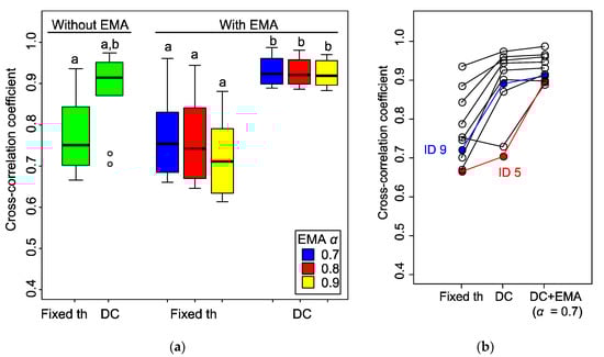 The results (Figure 8a) indicated that the application of the D-Counter to both the original and EMA filtered signals increased the cross-correlation coefficients. With EMA filter, there were significant differences between the coefficients in the fixed threshold and D-Counter methods (P < 0.05, Steel–Dwass test), whereas there was no significant difference between them without the EMA filter, presumably owing to the large individual differences (P = 0.23). The application of the EMA filter did not influence the median of the coefficients (P > 0.05 for both the fixed threshold and D-Counter), while it reduced the range of data distribution if it was utilised with the D-Counter (see two outliers in D-Counter without EMA). Although there were no significant differences in coefficients between the different smoothing factors α, the smaller α (0.7) slightly increased the median of the coefficients.