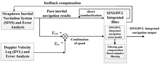 In this section, we first illustrate the framework for the SINS/DVL integrated navigation system based on a filtering gain compensation adaptive Kalman filter. Then, we describe each sub-module and its implementation.