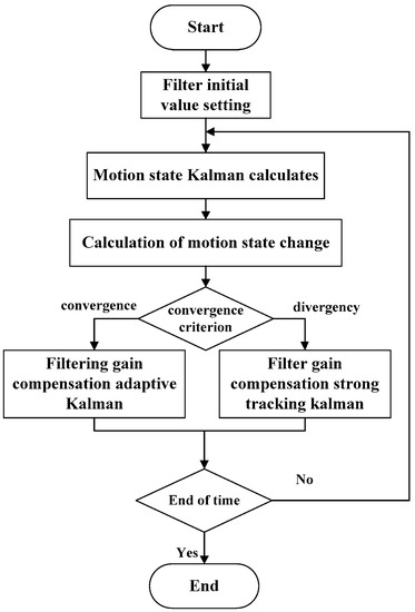 Figure 2 shows the workflow of the filtering gain compensation adaptive filtering algorithm. The filtering gain compensation algorithm was combined with the filtering gain compensation adaptive filter and the filtering gain compensation strong tracking Kalman filter. After filter initialization and parameter setting, we calculate the AUV’s state of motion using the Kalman filter, and judge whether the filter procedure is convergent or not, i.e., we determine whether the estimated error value is much larger than the error’s expected value or not. If it is, we use the filtering gain compensation adaptive Kalman filter to filter the position information. Otherwise, we utilize the filtering gain compensation strong tracking Kalman filter. Lastly, if the time period ends, we come to the procedure’s end. Otherwise, we perform the filter gain compensation adaptive filtering iteratively.